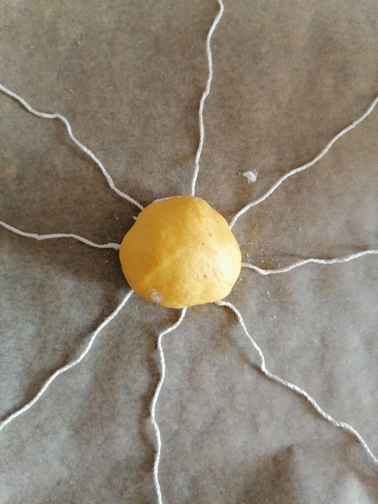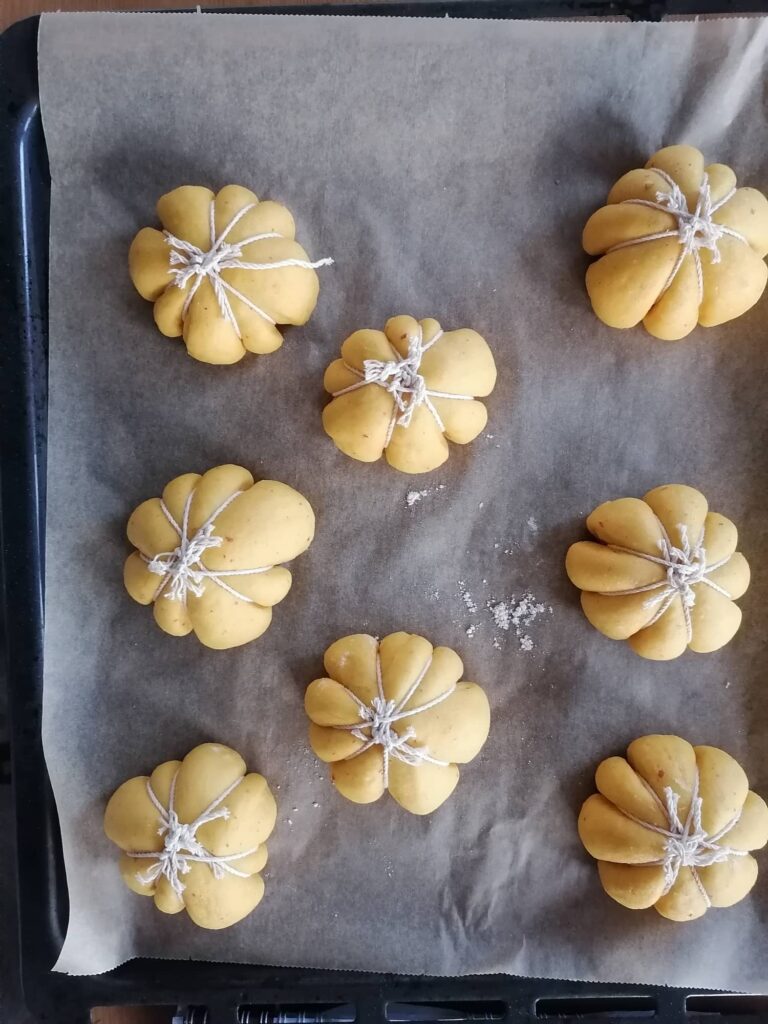 Pokud vlastníte robota, nechte ho pracovat. Tzn. s klidnou duší dejte všechny suroviny do něj a nechejte 10 až 15 minut hnětat. Důležité je, aby suroviny měly pokojovou teplotu. Pokud robota nevlastníte, nechte nejprve zahřát mléko, přidejte droždí a lžíci cukru a nechejte vzejít kvásek. Pak už smícháme další suroviny a vypracujeme hladké nelepivé těsto. Necháme krátce (30 minut) nakynout pod utěrkou. Poté vytvoříme z těsta 16 kuliček, které, pokud chcete, dejte kynout svázané do tvaru dýní. Příliš provázky neutahujeme, naopak, nechejte co nejvíce volné a zvolte nějaký přírodní motouzek. Pokud se vám nechce „hrát“ s tvarem dýně, klidně nechte jen bulky. Necháme ještě 2 hodiny (ano, čtete správně!) kynout pod utěrkou. Pečeme na pečícím papíru na 200 stupňů cca 12-15 minut podle trouby.