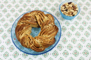 Necháme kynout asi hodinku. Poté těsto rozválíme na co nejtenčí placku, nejlépe obdélníkového tvaru. Tu potřeme připravenou směsí utřeného másla s cukrem a skořicí. Zarolujeme jako roládu a pak překrojíme podélně. Vzniklé dva copy spleteme a přeneseme na plech s pečícím papírem, kde vytvoříme z copu kruh. Pečeme cca 30 minut na 160 stupňů. Můžeme posypat před pečením mandlemi.