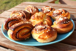 No a pokud nechcete jen klasické šneky – můžete udělat finské korvapuusti – nebudete tak krájet ze zarolovaného těsta kolečky ale šikmo trojúhelníčky. A pokud chcete další upgrade – zkuste těsto nerolovat, ale jen přeložit napůl, nakrájet na pásky a ty jako copánek ze dvou části smotat a dát mu tvar .