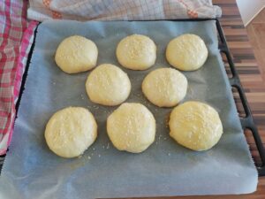 Všechny ingredience by měly mít pokojovou teplotu a máslo by mělo být vychladlé. Ideální postup je vše dát do robota a nechat vypracovat hladké těsto. Pokud robota nemáte, nejprve do vlažného mléka rozdrobíme droždí, přidáme cukr a necháme vzejít kvásek. Následně přidáme všechny suroviny a důkladně promícháme, vypracujeme hladké těsto. Necháme alespoň hodinku kynout. Vytvarujeme žemle, potřeme rozšlehaným vajíčkem a případně posypeme sezamovými semínky. necháme ještě pár minut nakynout. Pečeme v troubě na 200 stupňů cca 20 minut.
