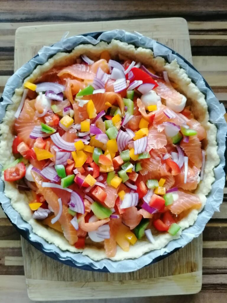 - šunka, losos, zelenina, sýr, cibule – tahle část je úplně na vás, koláč je ideální na spotřebování zbytků z lednice… já použila lososa, červenou cibuli, zelenou a žlutou papriku a balkánský sýr